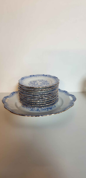 Prachtig gebaksservies van het bekende merk Bavaria bestaande uit een taartbord en 11 gebaksbordjes. Het servies is geproduceerd door Seltman Weiden uit Beieren W. Germany. Het servies heeft het motief genaamd Theresia en is barok geïnspireerd. De kleuren zijn wit en blauw, de randen zijn afgebiesd met een goudkleurige rand. Het servies valt onder shabby chic, romantisch, landelijk en vintage. Het is gemerkt aan de onderzijde en in zeer goede staat. Het taartbord heeft een doorsnede van 27 cm, de gebaksbordjes een doorsnede van 15 cm. Het vintage servies is in goede staat.