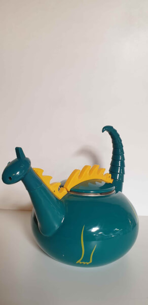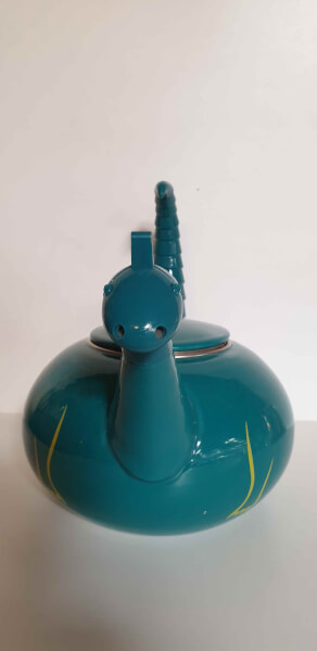 Prachtige en aparte theepot van het merk Copco in de vorm van een dino. Deze magische draak genaamd Puff is afkomstig uit de serie dieren van dit merk. De vintage theepot is nieuw zie ook de originele sticker aan de onderzijde. De kleuren zijn blauw groen met geel, de bek kan open om de thee uit te schenken. Al met al een echte decoratie op de theetafel. De hoogte is 19 cm, de breedte 30 cm en de doorsnede onderzijde is 15,5 cm.