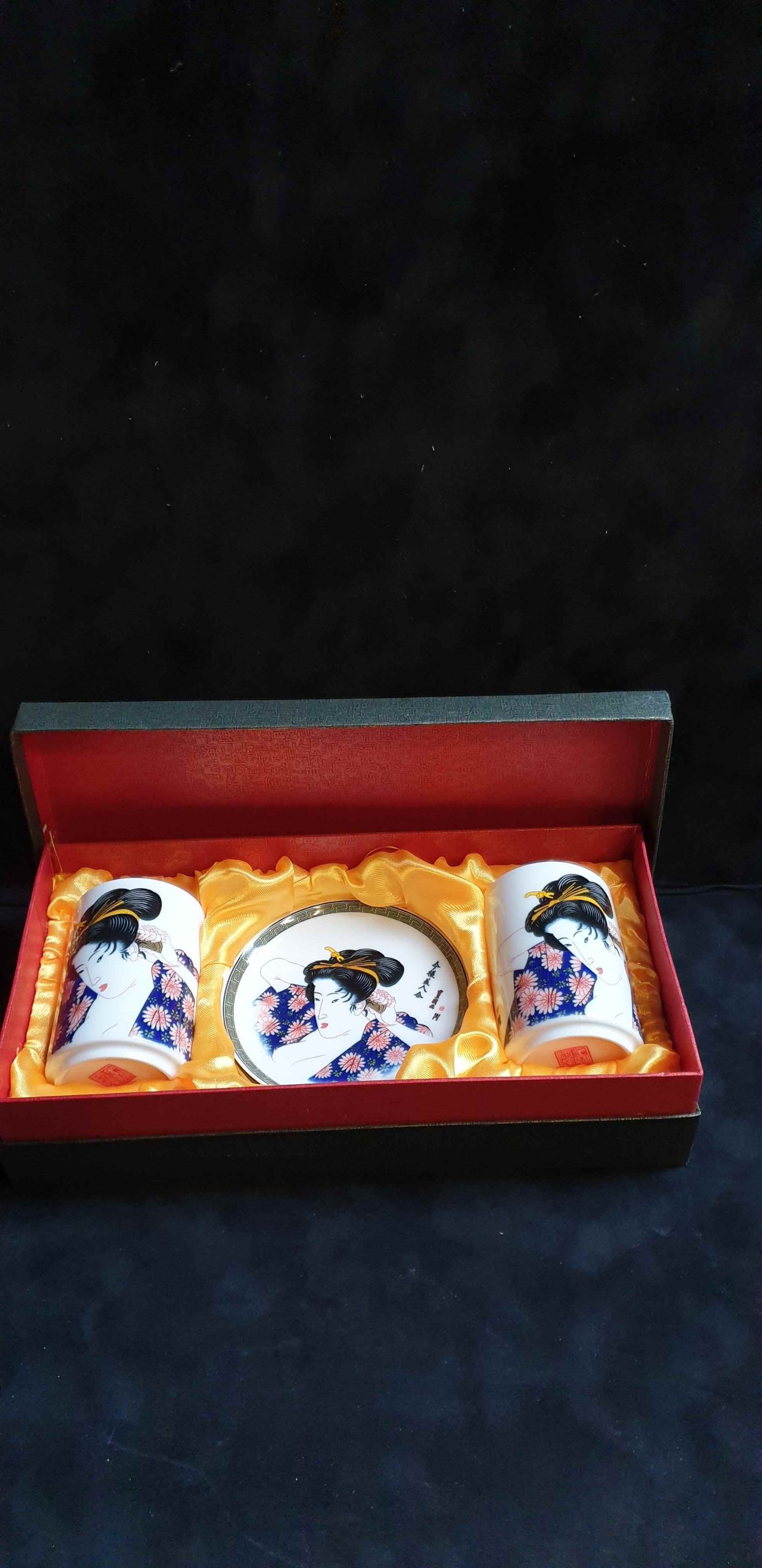In de originele verpakking  deze twee Geisha porseleinen kop en schotels. Alles is in nieuwstaat ondanks de vintage afkomst. Dit item komt uit de Japanse cultuur en is een echt verzamelitem. De schoteltjes hebben een doorsnede van 11,5 cm, de kopjes zijn hoog9 cm en hebben een doorsnede van 6 cm.