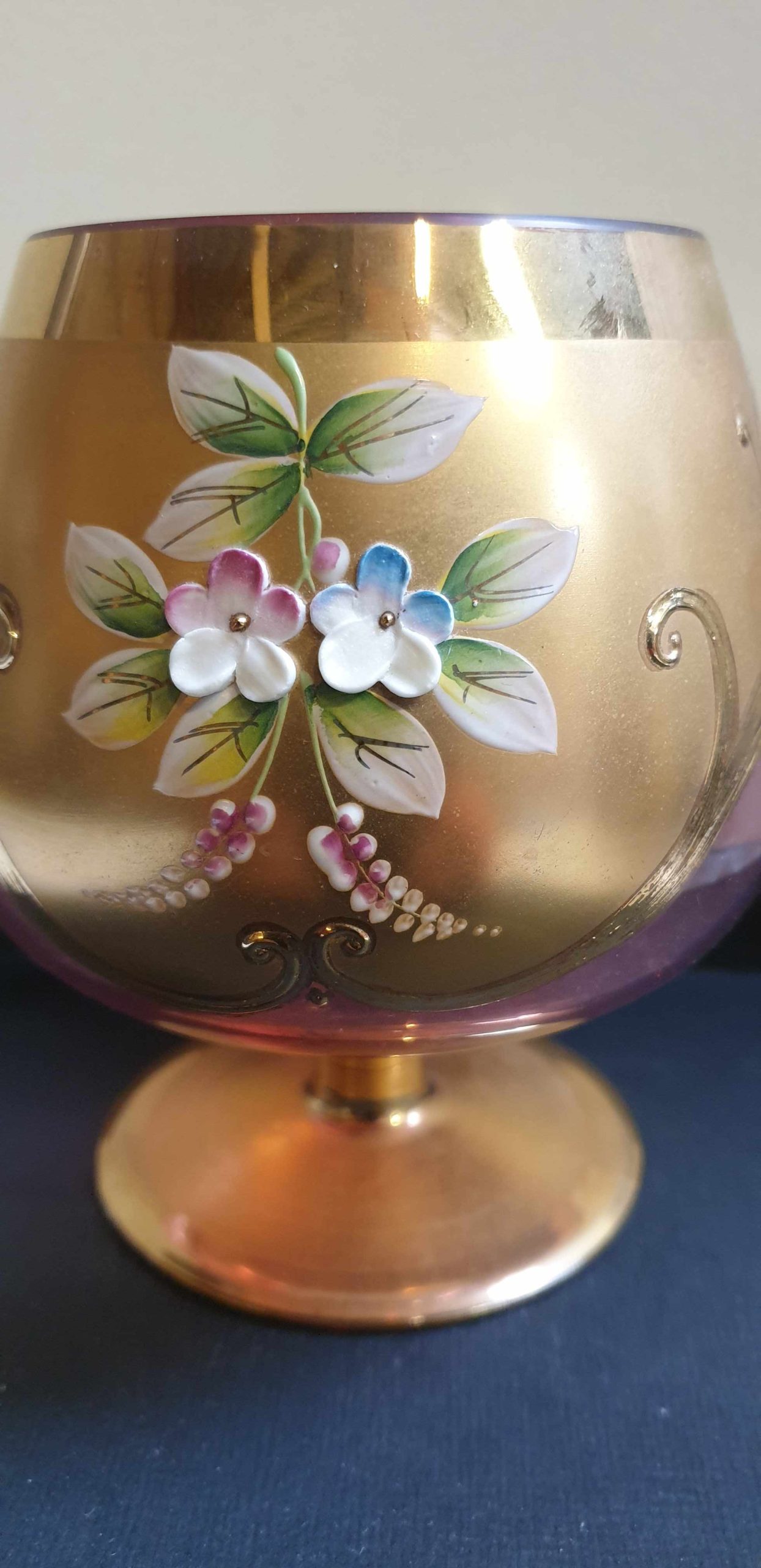 Prachtig cognacglas van het merk Murano. Het cognacglas is amber van kleur en is verguld. Het bloemdessin op het glas is handgeschilderd. Het vintage glas komt uit de jaren 70 en is in goede staat. De hoogte is 13 cm de doorsnede boven is 8 cm en de doorsnede onderzijde is 8 cm.