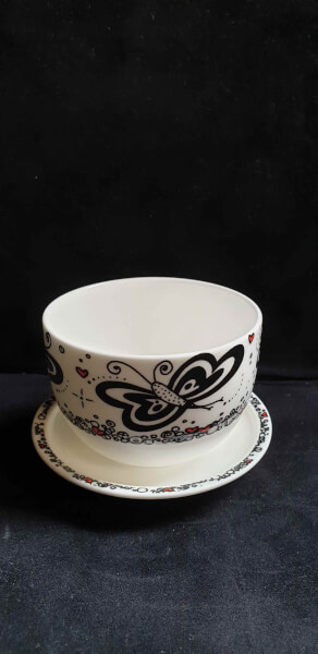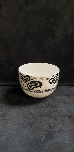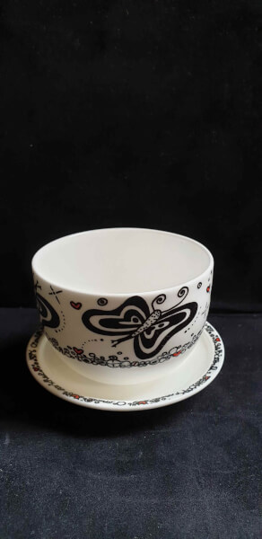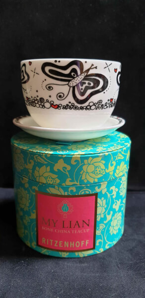 Uiterst kunstzinnig theekopje uit de collectie My Lian van het merk Ritzenhoff. Het kopje is nieuw en zit in de originele verpakking. Het theekopje is ontworpen door de kunstenares Petra Peschkes en is gemaakt van China bone. De doorsnede van het kopje is 7 cm, de doorsnede van de schotel 8,5 cm en de hoogt van kop en schotel is 5,5 cm.
