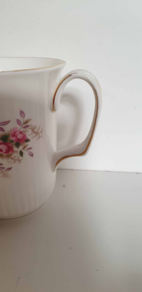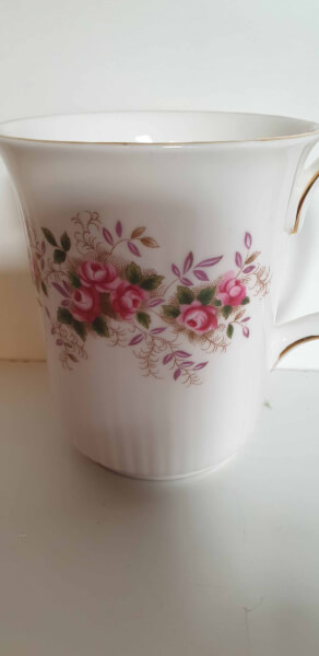 Mooie in zeer goed verkerende beker van het bekende Engelse merk Royal Albert. De beker is gemaakt van wit Bone China porselein en afkomstig uit het servies Lavender Rose. De beker heeft een reliƫf en is gedecoreerd met rozen. Het oor is afgebiesd met een goudkleurig randje. De hoogte is 10 cm de doorsnede is 8,5 cm. De beker is gemerkt aan de onderzijde.