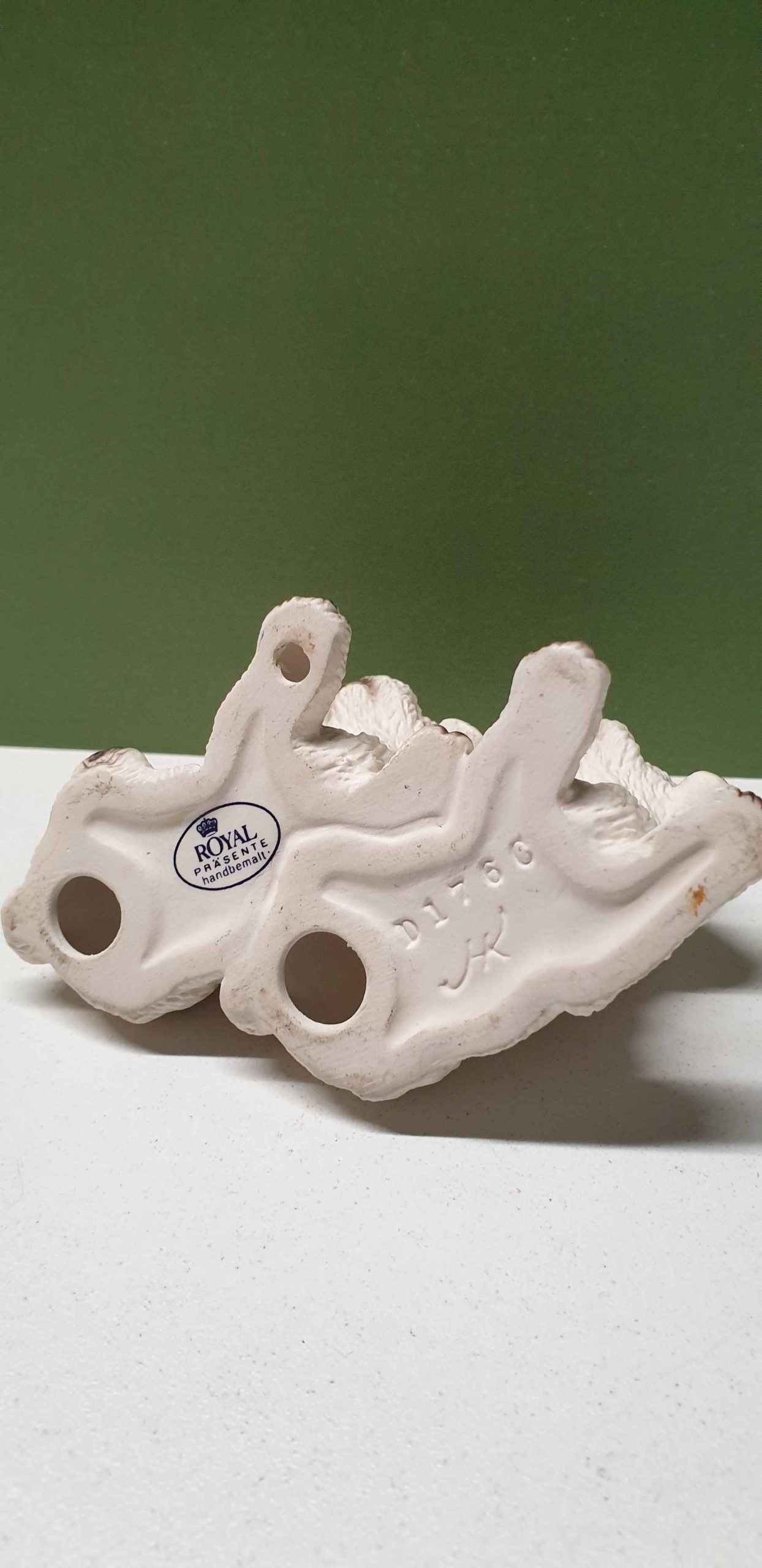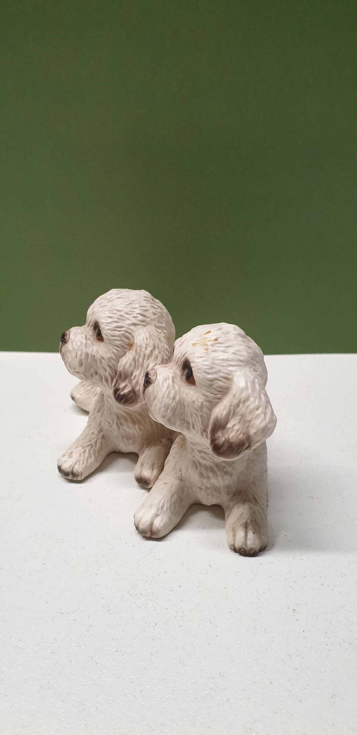 Van het merk Royal Präsente een schattig beeldje van twee kleine hondjes dicht tegen elkaar aangekropen. Het keramieke beeldje is met de hand gemaakt en afkomstig uit de jaren tachtig. Het vintage beeldje is hoog 6 cm, breed 9 cm, diep 5 cm en gemerkt aan de onderzijde.